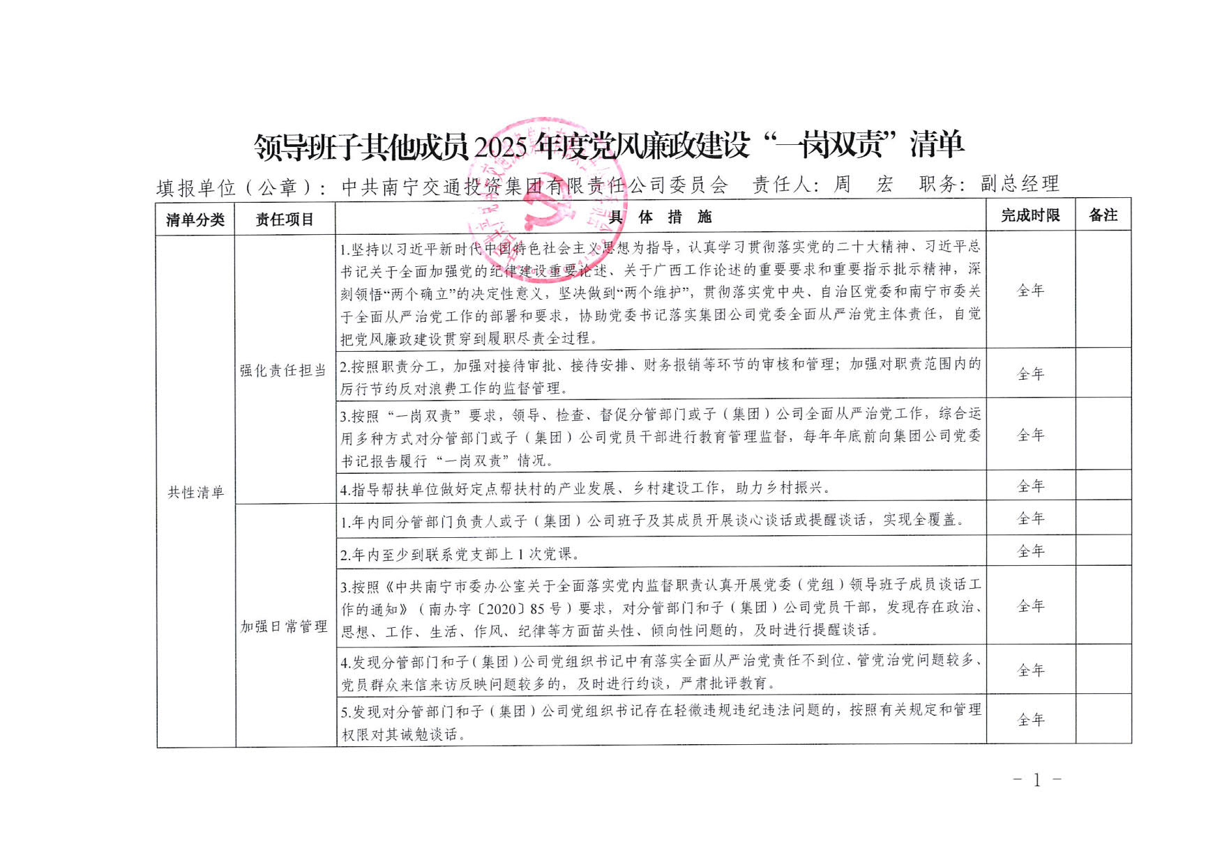 南寧交投集團領導班子其他成員2025年度黨風廉政建設“一崗雙責”清單(五)