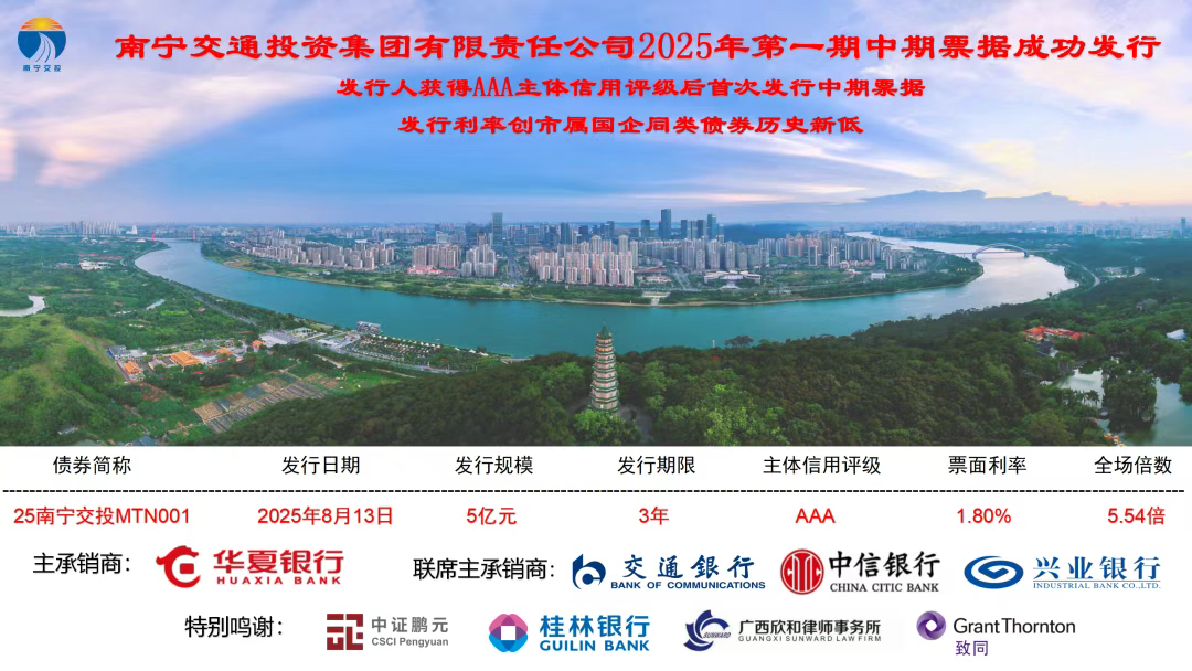憑借良好的經(jīng)營業(yè)績、穩(wěn)健的財務(wù)表現(xiàn)和優(yōu)異的發(fā)展前景,8月13日,南寧交投集團(tuán)成功發(fā)行2025年度第一期中期票據(jù),發(fā)行金額5億元,期限3年。